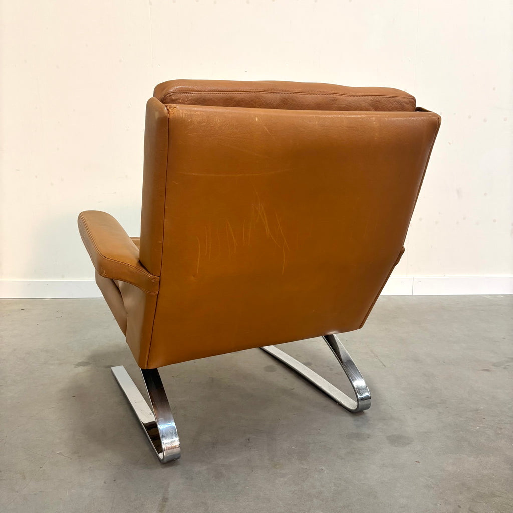 Chrome frame with cognac leather upholstery.