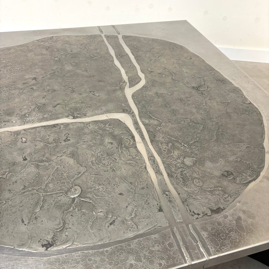 Wooden base with stainless steel table top. Table top has been etched and covered with tin.